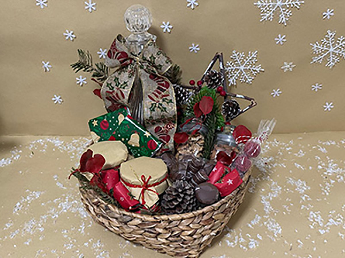 Christmas Basket that includes pesto sauce jar, 1 jam jar and 400g of Belgium chocolate