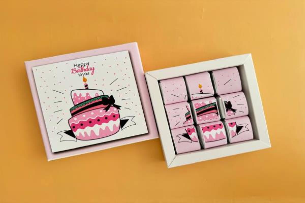 A birthday chocolate box filled with 18 wrapped pieces with birthday wishes.