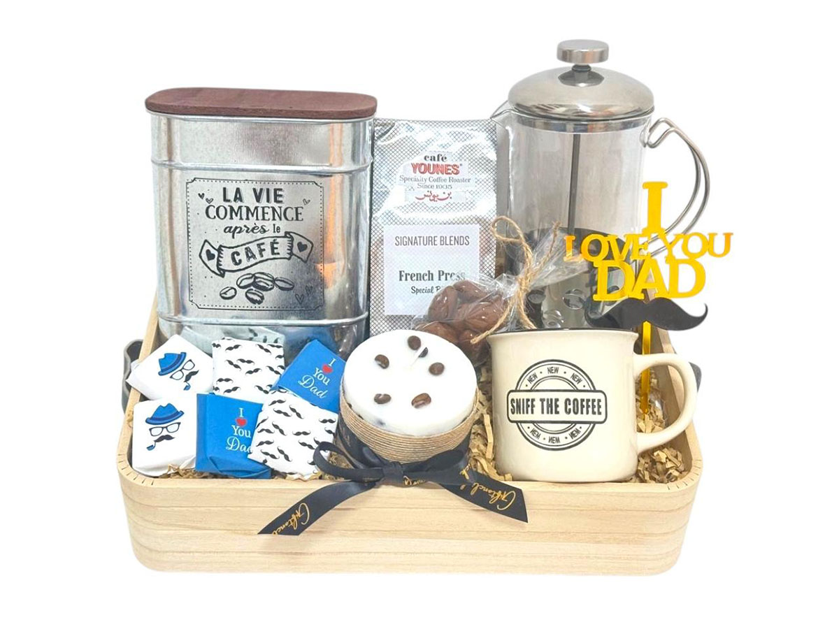 For the coffee lovers, this tray is the perfect gesture! Complete with a coffee canister, cafe Younes coffee grounds, a french coffee press, chocolate dragee pieces, nuts, a chocolate bar, a coffee bean candle, and a coffee mug,