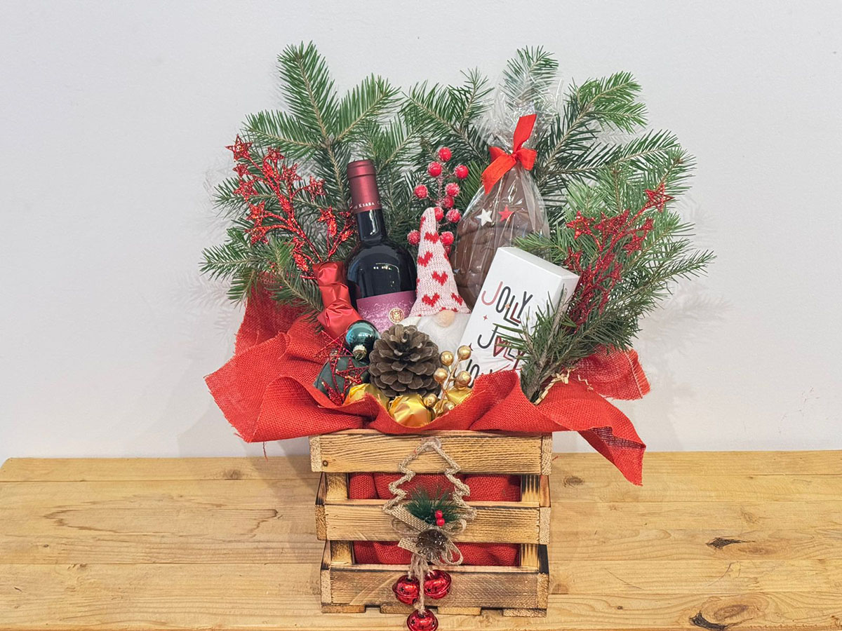 The Christmas Candy Crate is an adorable gift for your loved ones this season, filled with Lindt Pistachio chocolate box, a jar of strawberry jam, one Lindt Santa shaped chocolate, an assortment of chocolate pieces, a Christmas lantern decor, and a candy shaped ceramic tray and a candy shaped ornament.