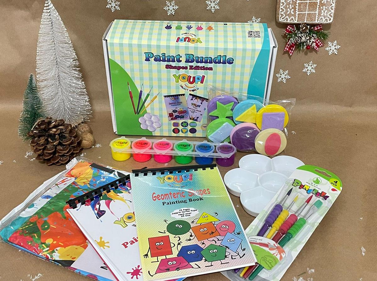 Stimulate your childs mind while they play with the Yuppi World Paint Bundle Shapes Edition! Complete with one painting apron, two shape themed painting books, one paint set with vibrant colors, one paitbrush set, one set of sponge shapes, and one paint pot, this is the perfect educational play time kit!