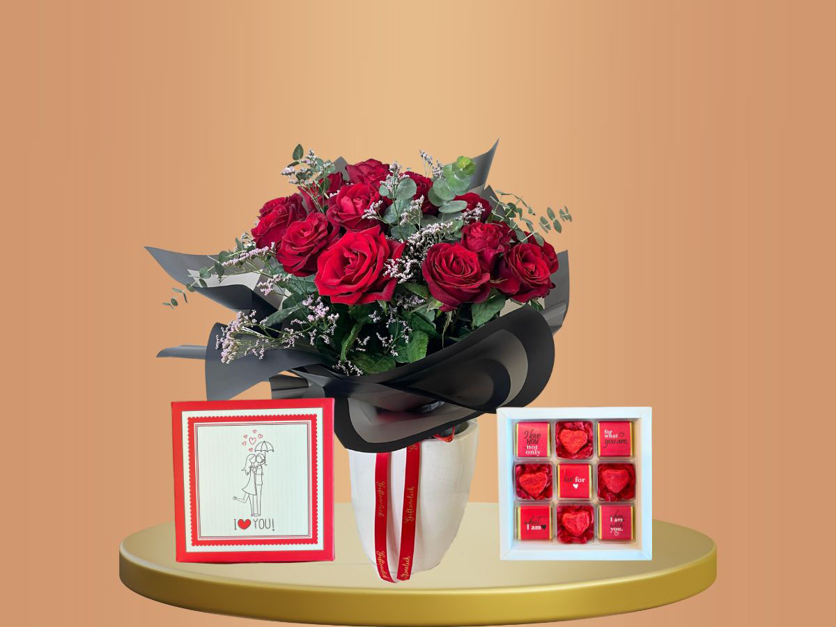 Celebrate your love with this adoring gift bundle! This set includes a beautiful arrangement of 10 red roses, alongside an I Love You themed chocolate box with 18 chocolate pieces.